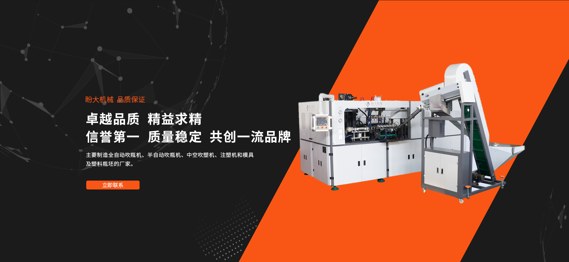 臺(tái)州盼大機(jī)械有限公司座落于東海之濱, 著名的“蜜桔之鄉(xiāng)”和“模具王國(guó)”—浙江黃巖。主要制造全自動(dòng)吹瓶機(jī)、半自動(dòng)吹瓶機(jī)、中空吹塑機(jī)、注塑機(jī)和模具及塑料瓶坯的廠(chǎng)家。本廠(chǎng)擁有多年的生產(chǎn)經(jīng)驗(yàn),采用進(jìn)口和國(guó)產(chǎn)的高質(zhì)量生產(chǎn)設(shè)備和檢驗(yàn)儀器。MT系列多功能吹瓶機(jī)是本廠(chǎng)生產(chǎn)和研發(fā)的一種操作簡(jiǎn)單、成品率高、適用性廣、可靠性穩(wěn)定的吹瓶機(jī)。采用進(jìn)口的先進(jìn)氣動(dòng)元件,設(shè)計(jì)以高效益,高精度,維修安全,集美觀(guān)耐用于一體。